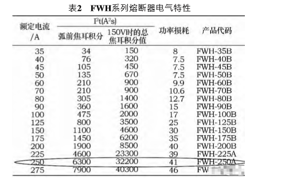 1)根據(jù)連續(xù)負載電流及環(huán)境溫度,初步選擇一款熔斷器,暫選美標FWH系列,型號為FWH250A(電流250A,電壓500V),In=250A。