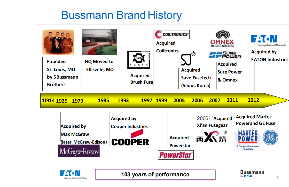 1985年,Cooper(庫柏工業(yè))購買該公司,成立了新的事業(yè)部—“CooperBussmann熔斷器”, 如今它是世界上熔斷器電路保護及相關(guān)配件的最知名品牌。