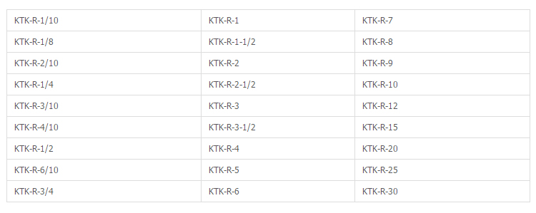 產(chǎn)品型號(hào):KTK-R-9,KTK-R-8,KTK-R-7,KTK-R-6/10,KTK-R-6,KTK-R-5,KTK-R-4/10,KTK-R-4,KTK-R-3-1/2,KTK-R-30,KTK-R-3/4,KTK-R-3/10,KTK-R-3,KTK-R-25,KTK-R-2-1/2,KTK-R-20,KTK-R-2/10,KTK-R-2,KTK-R-15,KTK-R-12,KTK-R-1-1/2,KTK-R-10,