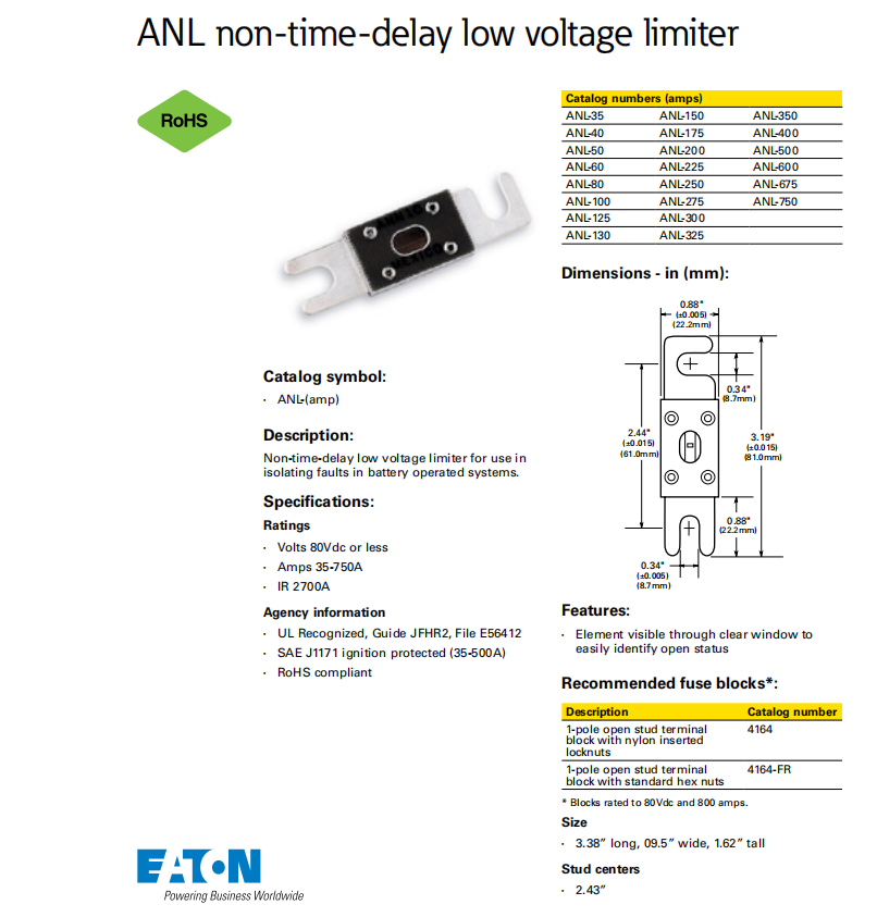 ANL系列延時保險絲80Vdc ANL-275 ANL-300 ANL-325 ANL-35 ANL-350 ANL-40 ANL-400 ANL-50 ANL-100 ANL-125 ANL-130 ANL-150 ANL-175 ANL-200 ANL-225 ANL-250 ANL-500 ANL-60 ANL-600 ANL-675 ANL-750 ANL-80