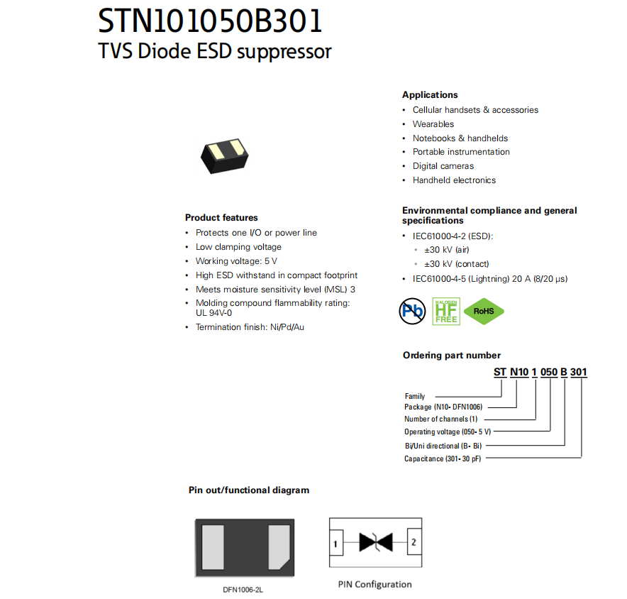 STN101050B301系列 TVS二極管ESD抑制器